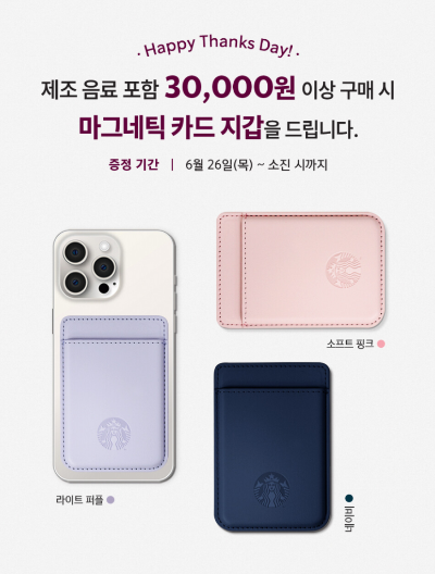 스타벅스에서 제조 음료를 포함해 총 3만 원 이상 결제하면 카드지갑을 1개 받을 수 있답니다.